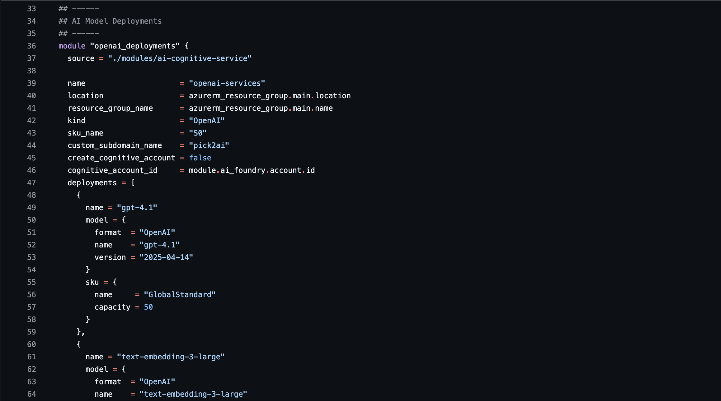 ai-cognitive-service: This module handles OpenAI and other cognitive service deployments with flexibility in mind - it can either create a new Cognitive Services account or deploy models to an existing one. It's your go-to for spinning up GPT-4, GPT-3.5, or other cognitive models with proper SKU and capacity management.